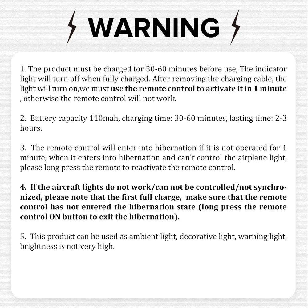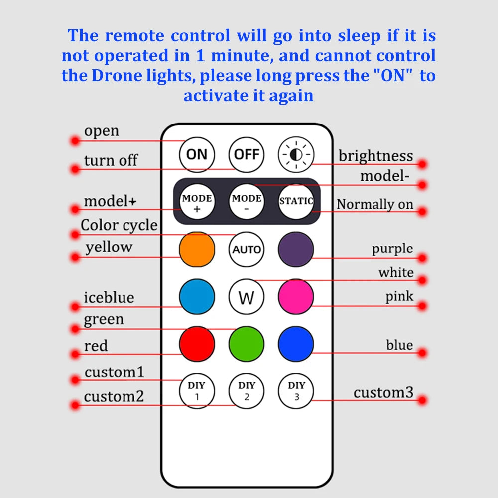 A:If the aircraft light has no remote control operation for more than 1 minute, it will enter sleep mode to save power (the aircraft light cannot be controlled by the remote control in sleep mode). We can press and hold any button on the remote control to make the aircraft light exit sleep mode. It can be controlled by the remote again.